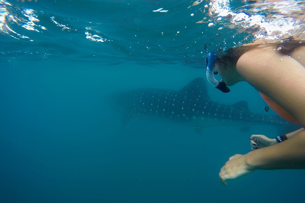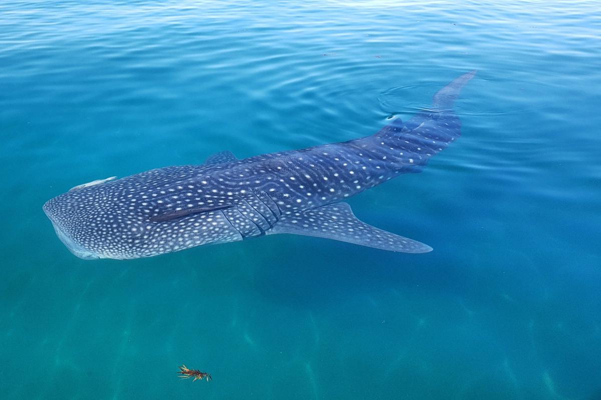 El más grande de todos los tiburones y el pez más grande que existe, el Tiburón Ballena. Su gran tamaño, sus patrones distintivos y su enorme boca frontal lo hacen inmediatamente reconocible y puede ser visto comúnmente vagando cerca de la superficie en aguas tropicales y subtropicales de alrededor del mundo.